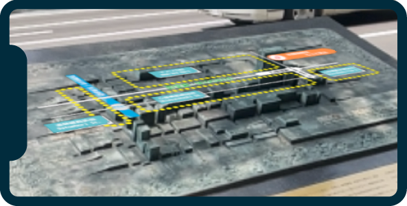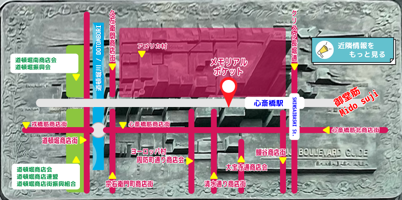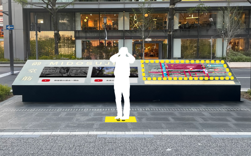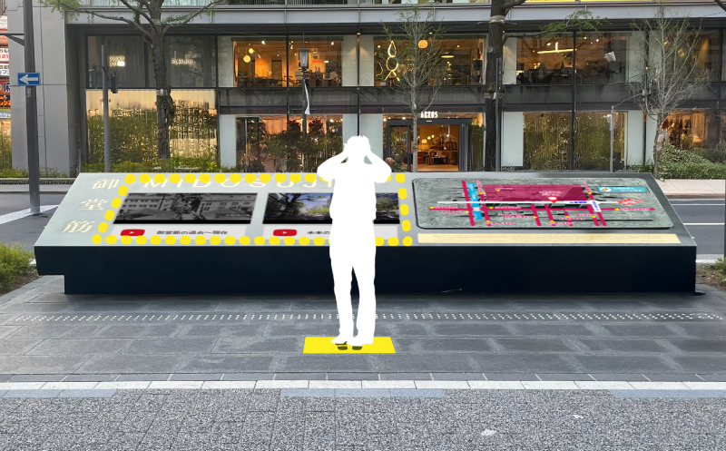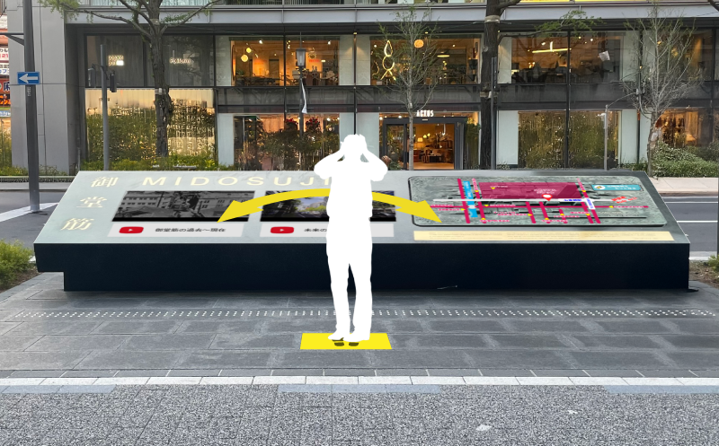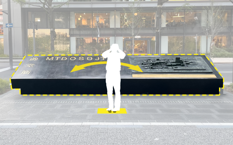 スマホカメラの向きを変えたりメモリアルポケットの前を移動することで、エリアマップや御堂筋の紹介映像をご覧いただくことができます。