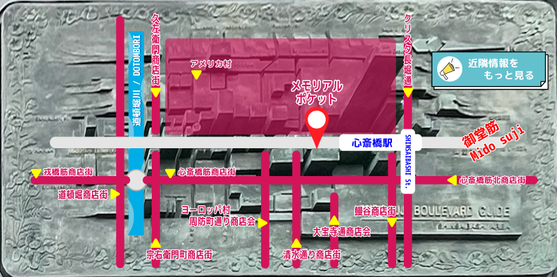 ●道頓堀の東の玄関口 堺筋でバスを降りて、道頓堀のゲートをくぐれば、ここからミナミが始まります。おでんやうどん、ラーメン、カニ専門店などミナミの老舗飲食店、カラオケ店や競馬の場外券売場など、地元の人がよく利用するまちです。 ●食いだおれとネオンの街 大阪ミナミのメインストリート。歌舞伎の劇場があり、かつては大阪のブロードウェイとも呼ばれていた。うどん屋・たこ焼き店やお好み焼き店が多く、粉ものめぐりも楽しめる。中国語・韓国語表記でのメニューを置いてある店も多い。