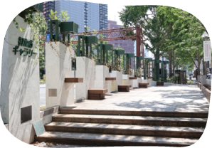 御堂筋ギャラリーは御堂筋完成60周年を記念して整備された休憩施設です。これまでアート作品展が開催されるなど、情報発信、交流の場としても活用されてきました。