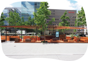 いちょうテラス高麗橋は、にぎわいと憩いの空間を創出する休憩施設です。一部拡幅した歩道上にウッドデッキを配し、その上にベンチ、パーゴラ、地域情報案内板などを設置しています。