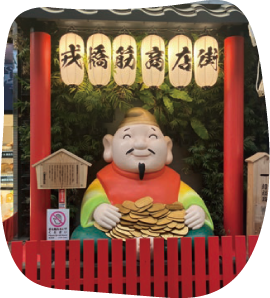 江戸時代から十日戎のおまいりで賑わった戎橋筋。高さ2メートルを超える「えぴたん像」は、商店街のキャラクターとして、まちのにぎわいと往来する人々の招福をいつも願っています。